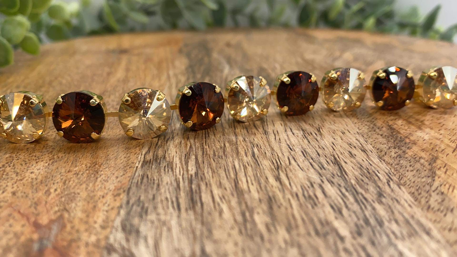 12mm gold bracelet with brown and crystal golden shadow crystals set in gold metal. Approx. 8 inches long including extension chain.