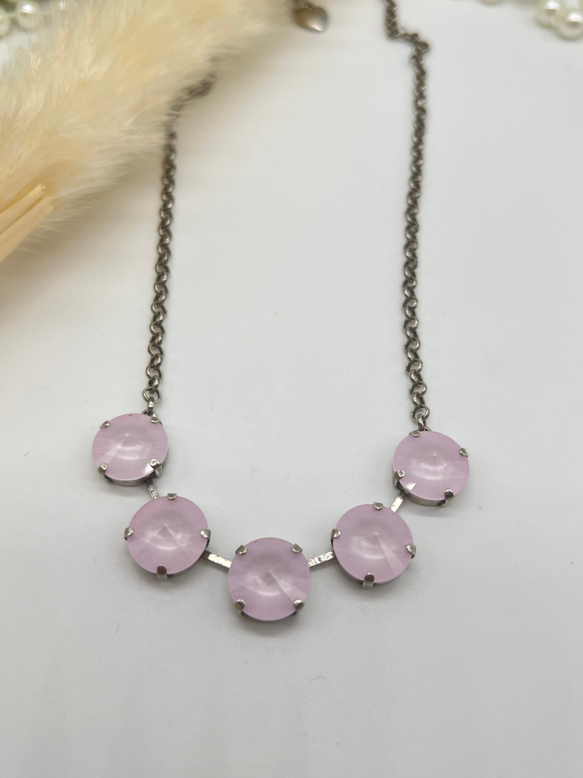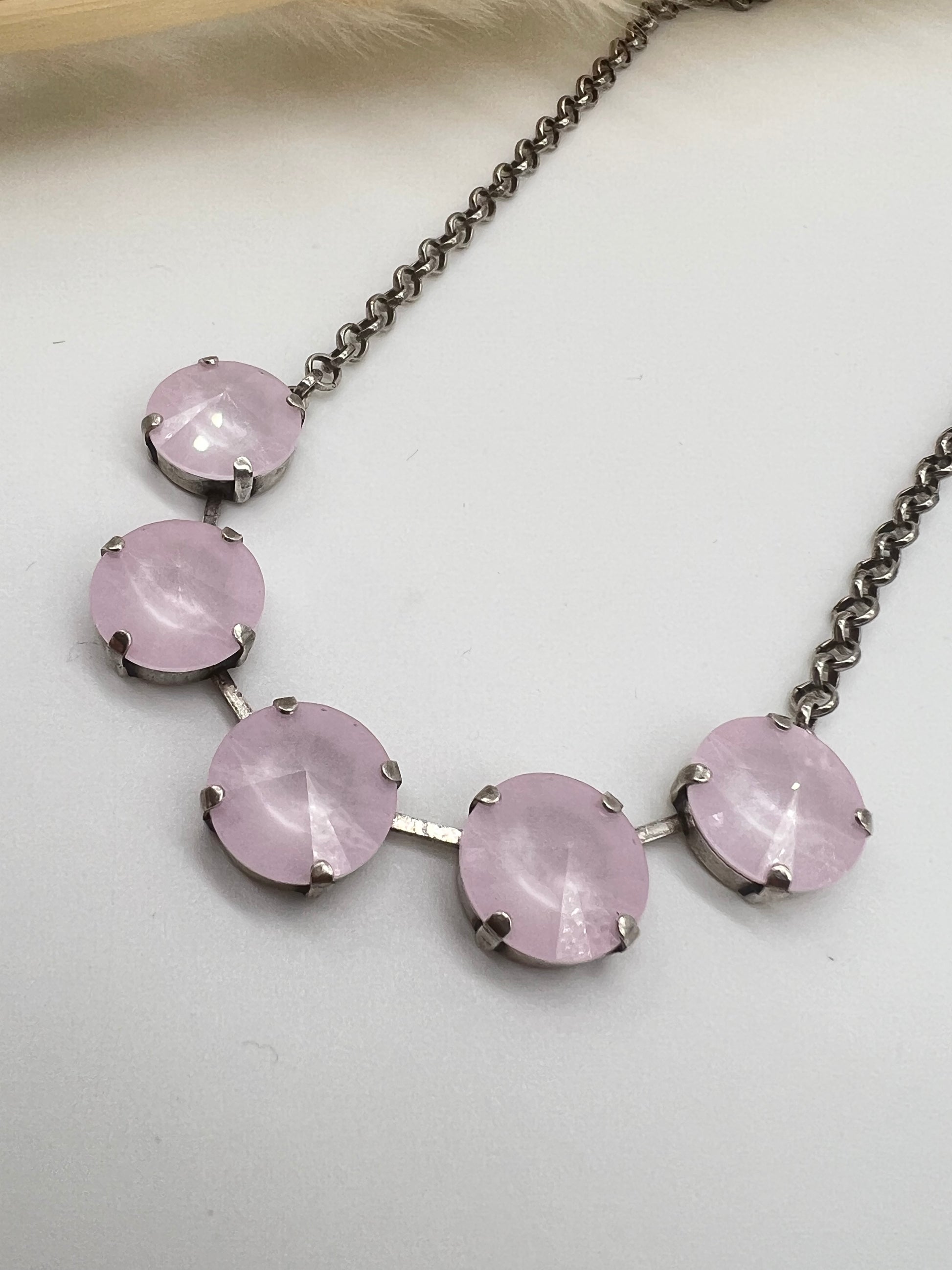 Large 14mm soft pink 5 stone necklace! Set in antique silver metal.